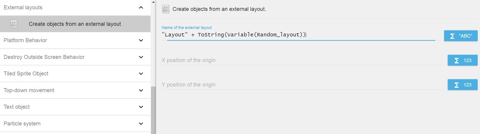 • In the Name of the external layout field, type "Layout" + ToString(Variable(Random_layout)). This will randomly add one of the external layouts to the scene.