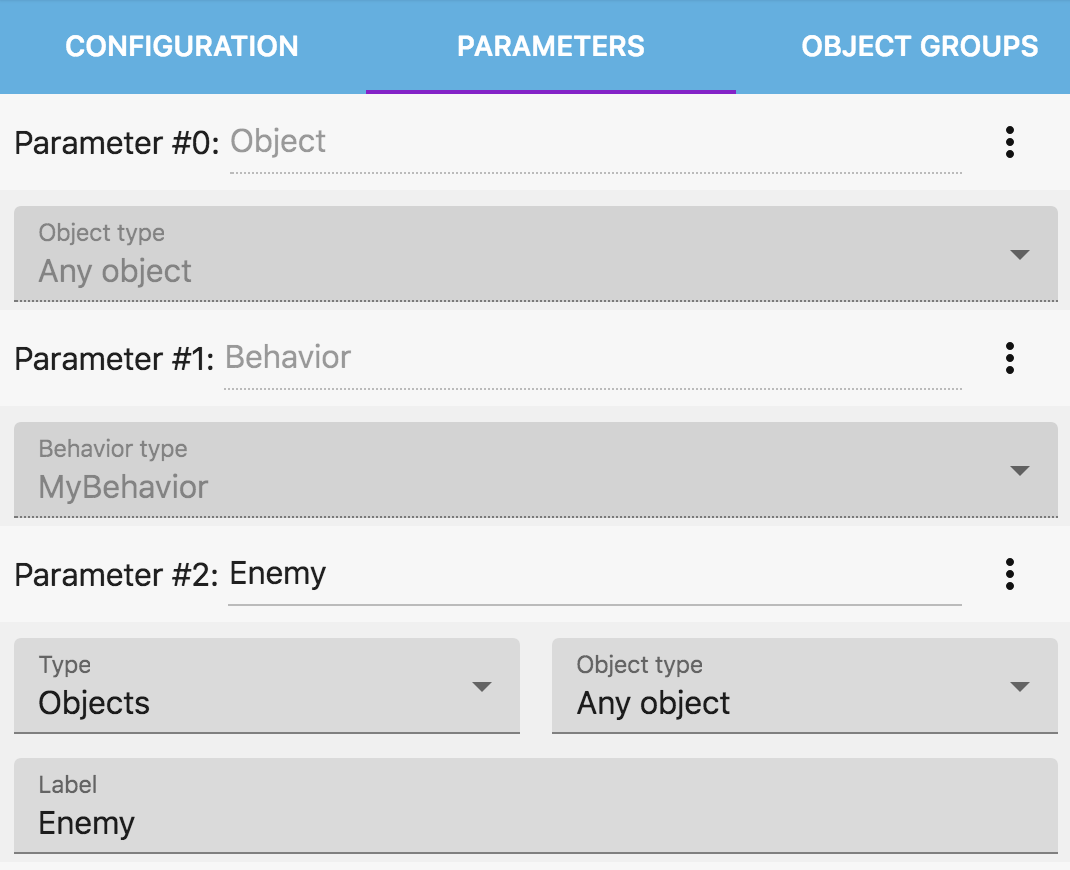 Navigate to the function "Parameters" tab and in the bottom choose "Add a parameter". Then, enter "Enemy" for the parameter name, then "Objects" for the type. You can enter "Enemy" as the label too (this is what will be displayed when you add the action in the scene events sheet).